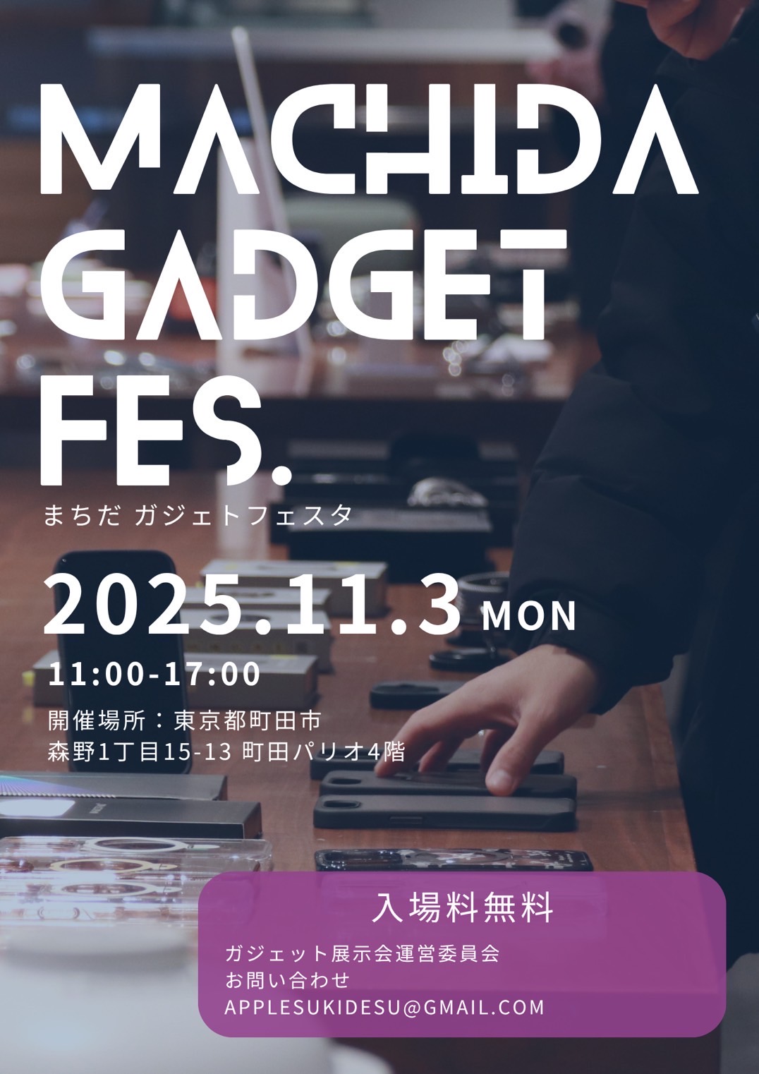 まちだ ガジェットフェスタ by ガジェット展示会 開催:2025年11月3日(月・祝) 〜最新のガジェットに触れて、見て、試せる体験型展示イベント〜最新のガジェットに触れて、見て、試せる1日限りの手体験型展示イベント! 国内外のガジェットブランドやスタートアップが町田に集結。 ものづくりの楽しさ、最新技術の驚きをぜひ会場でご体感ください。 当日は、ガジェット好きな方から、初めての方、ファミリーまで楽しめる内容が盛りだくさん。 ガジェット展示だけでなく、ミニワークショップやお子様向けの体験コーナーも開催予定。 「欲しかったアレに出会えるかも?」 開催概要日 付2025年11月3日(月・祝)時 間11:00〜17:00(予定)会 場4F パリオフィールド料 金入場無料主催ガジェット展示会運営委員会公式ページWebサイト 公式X お問合せMAIL: applesukidesu@gmail.com < 前へ一覧へ »新着イベント情報イベント開催:2025年10月8日(水)〜13日(月・祝)【パリコレッ!芸術祭】WEEK 6詳しくはこちらイベント開催:2025年10月11日(土)〜13日(月・祝)キン・シオタニ 原画フリマと似顔絵イベント詳しくはこちらイベント開催:2025年11月1日(土)〜5日(水)〜パリオ応縁プログラム〜 成田油絵サークル金曜会 油絵展詳しくはこちら