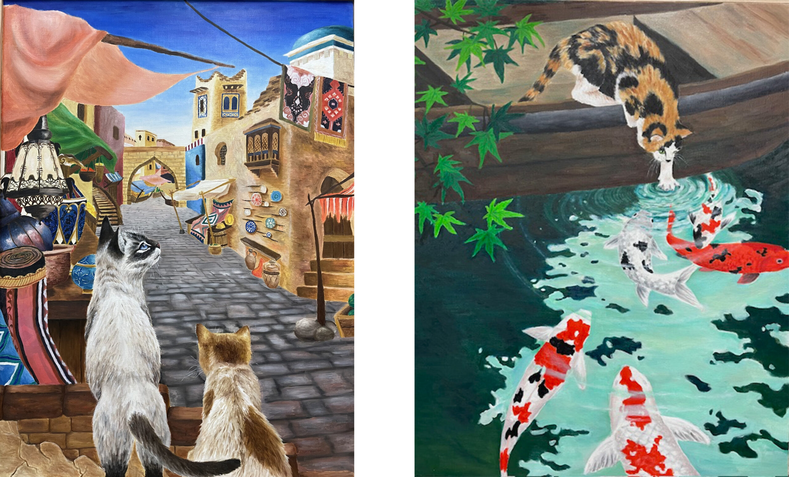 伴侶動物であると同時に、野生動物でもある猫に惹かれ、「猫」をテーマにした作品を多く描いてきました。振り返ってみると、どこか人の営みを感じる空間の傍らで生きる彼らに思いを馳せながら筆を動かしていたように感じます。