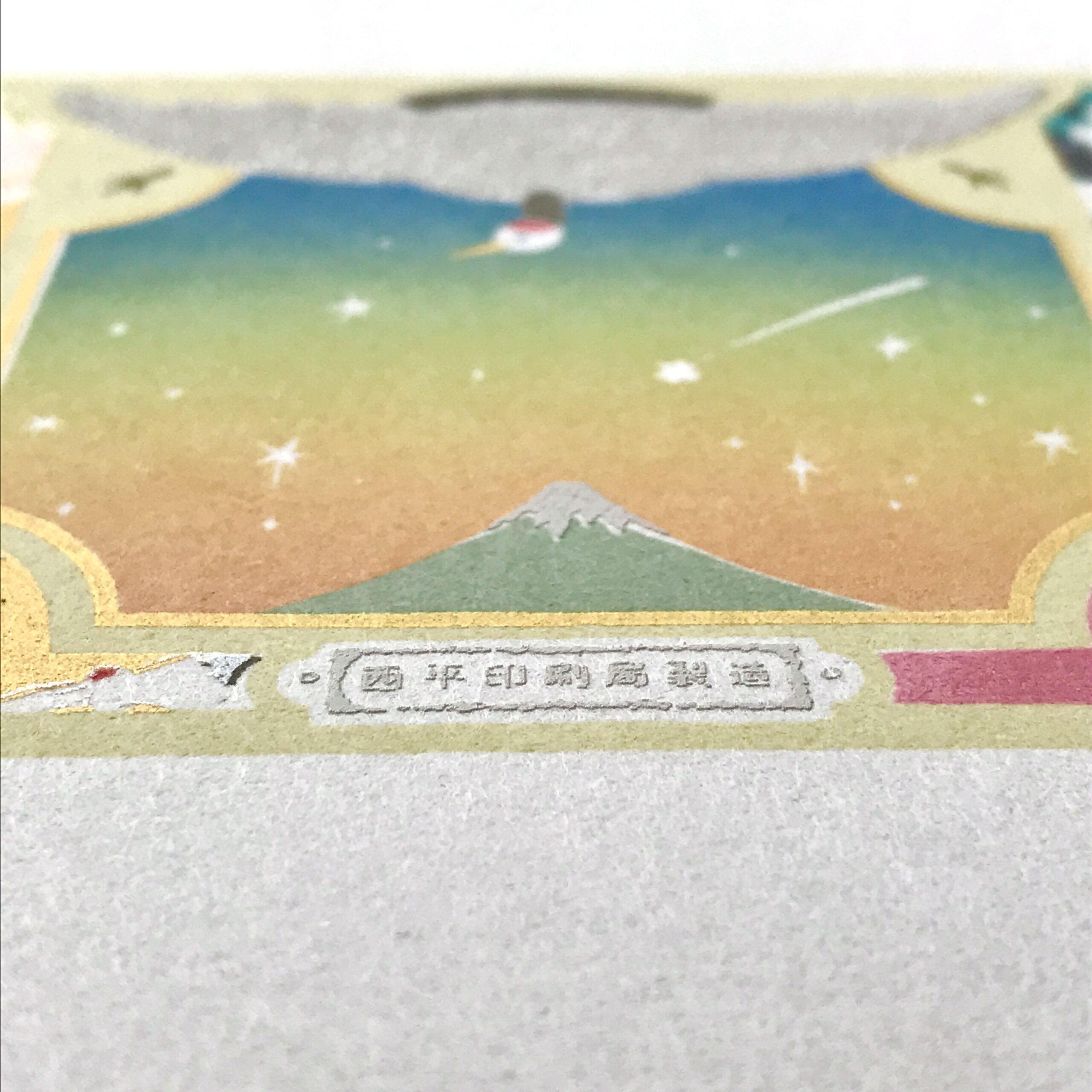 モチーフ単体で描くものもあれば、近頃ではその中に自分のイメージや言葉を組み合わせ、新たなものを生み出すという制作になっています。例えば、鳥モチーフの蒐集品の作品に、新たに“巣作り”の要素を入れたら面白そうだなとか、言葉遊びで、空想の何かを作れないかなとか。鳥の鳴き声が香りになったらいいなと思い、タイトルを「さえずりは香(こう)」と付けてみたり。あとは浮世絵の「立版古(たてばんこ)」という、紙をくり抜いて組み立てる現代のペーパークラフトのようなジャンルが当時からあったんですけど、それを参考に制作をしたこともありました。ラベルや小さい香水瓶をモチーフに作るのも好きです。特にお札・切手・ラベルの作品はシリーズで展開していますね。シルクスクリーンで制作しているお札のシリーズはできるだけ細かくしてやろうと思って、かなり細かく模様を入れています。器や和物をモチーフにしていた時期は、家にあるお気に入りの食器や陶器など、実際にあるモチーフ同士を組み合わせて登場させてみたり。モチーフ自体を簡略化するようになってからは、なるべく陰影をなくして形や模様で遊んでみたり、色やリズムで魅せれないかなと、色々試しました。また、いつの頃からか“その絵を手にしたら運が良くなる”という気を込めて、縁起物の作品も作るようになりました。