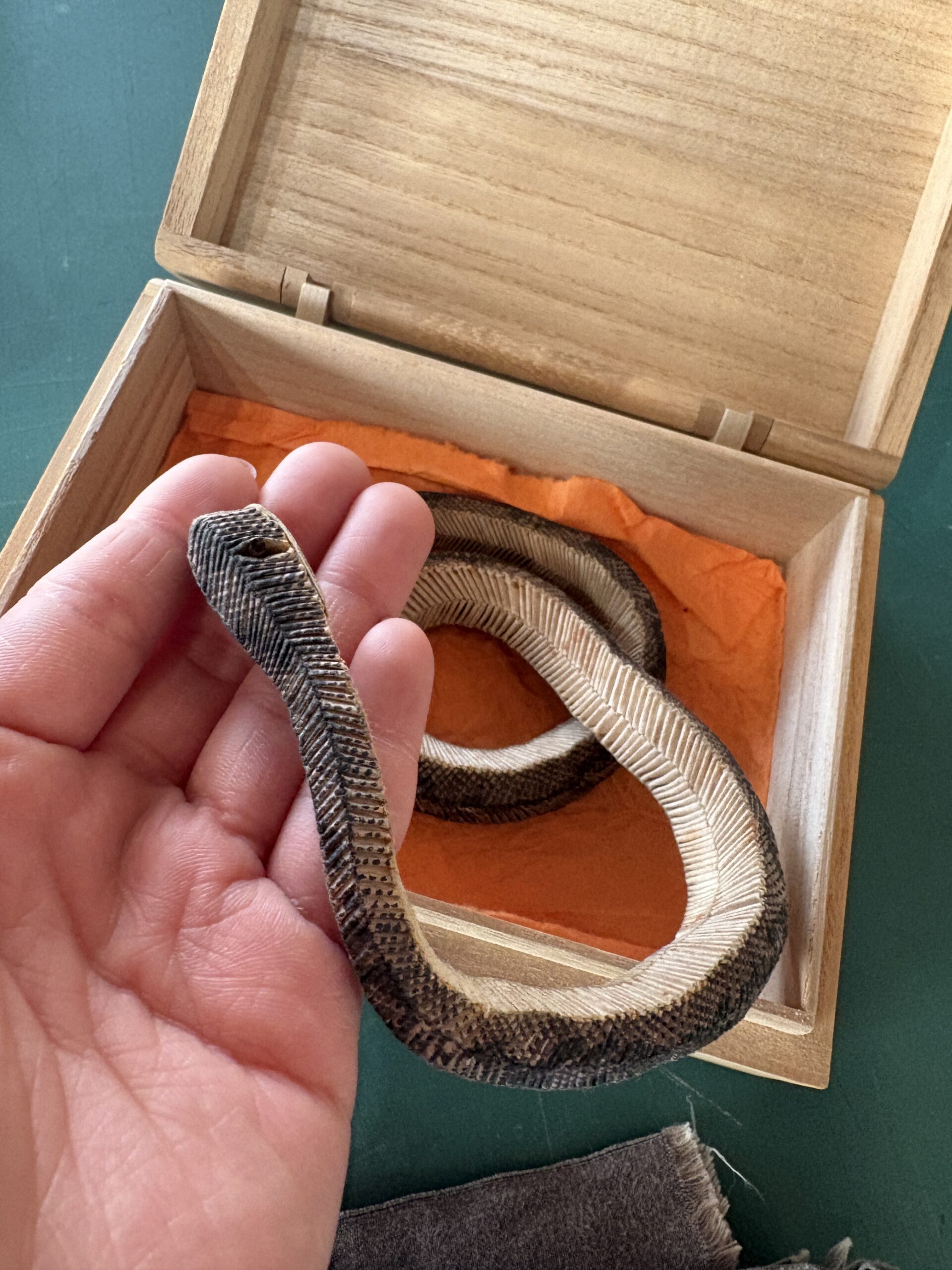 これは昔の郷土玩具で、和紙で作られた折り紙の蛇のおもちゃなんですけど、ものすごくリアルなんです。質感や蛇のうねる感じもかなり再現度が高くて、紙とは思えないくらい緻密に細かく折り込まれています。目もガラスでできているし、当時の職人の技術力や文化風習なんかも感じ取ることができる逸品です。普段、高校で講師をしているのですが、和紙を取り扱う授業の際はこのおもちゃを持っていって、教材として役立てています。大阪の博物館でも同じ品が所蔵されているそうで、手に入ったのはラッキーでしたね。(笑)