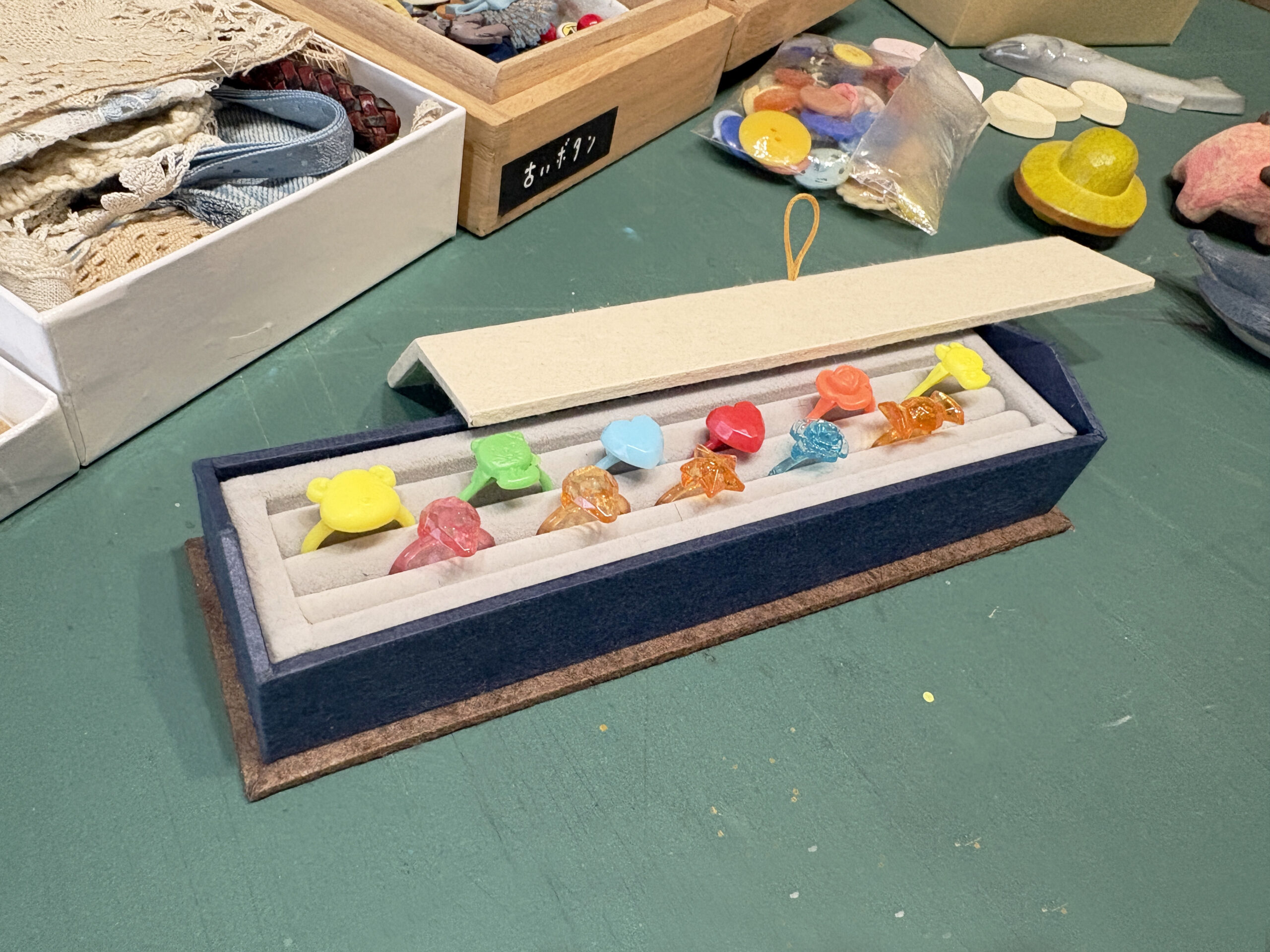 講座の題材は、基本的に自分ができることがベースですが、“ありそうでない、あったら面白いだろうな”というものが多いです。ベーシックな技術の回もありますが、マニアックな題材を探す時は、外に出て展覧会だったりお店を回ってヒントを探します。そして題材が見つかったら、どうすれば面白くなるかを考えます。例えば、雑貨店で指輪の収納ケースを見つけ、それを自分の持っている製本技術と組み合わせたら、もっと可愛くなるんじゃないかなと製本作りの応用版で、「指輪のためのおうちづくり」をやってみたりしました。あとは、季節によって題材を変えてみたりもします。