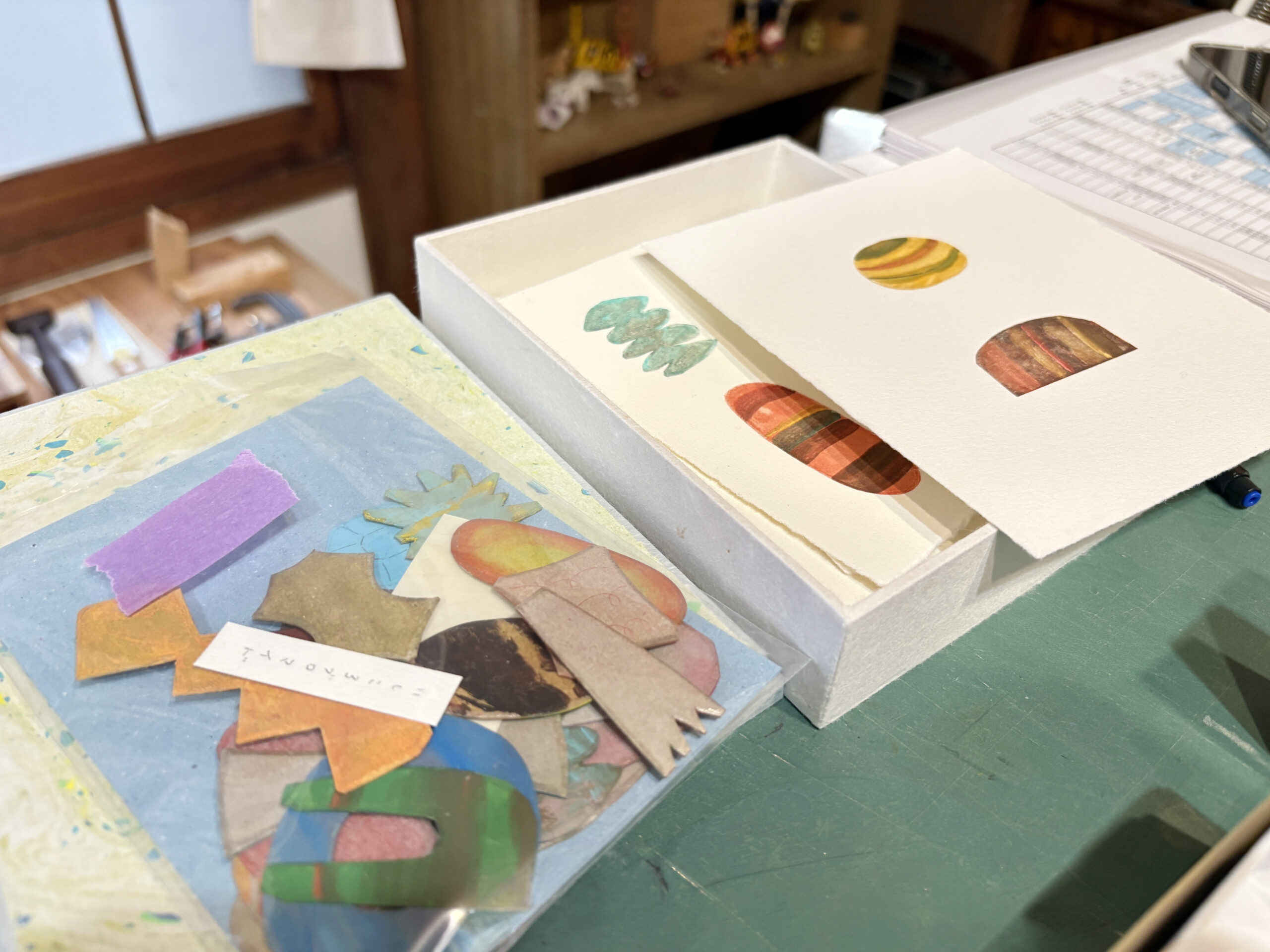 小さい作品の方が自分にとってやりやすいというか、性に合ってるなというのがありまして、制作を続けるうちに、掌サイズの世界観が僕はいいなっていうのが分かってきたんです。手に取って色々な方向からじっくり物を観察する行為と、角度を変えて版画作品を鑑賞する行為はリンクするところがあるかなと思いました。学生時代に高さ120cmくらいのシルクスクリーン作品を作ったことがありますが、大きい作品では細部を虫眼鏡で覗いてるような魅せ方もできる反面、刷り重ねの表情変化が伝わりづらかったんです。やっぱり近くで見る醍醐味を体験してもらうには、小さい作品を色んな角度から鑑賞してもらうのがいいなと思いました。