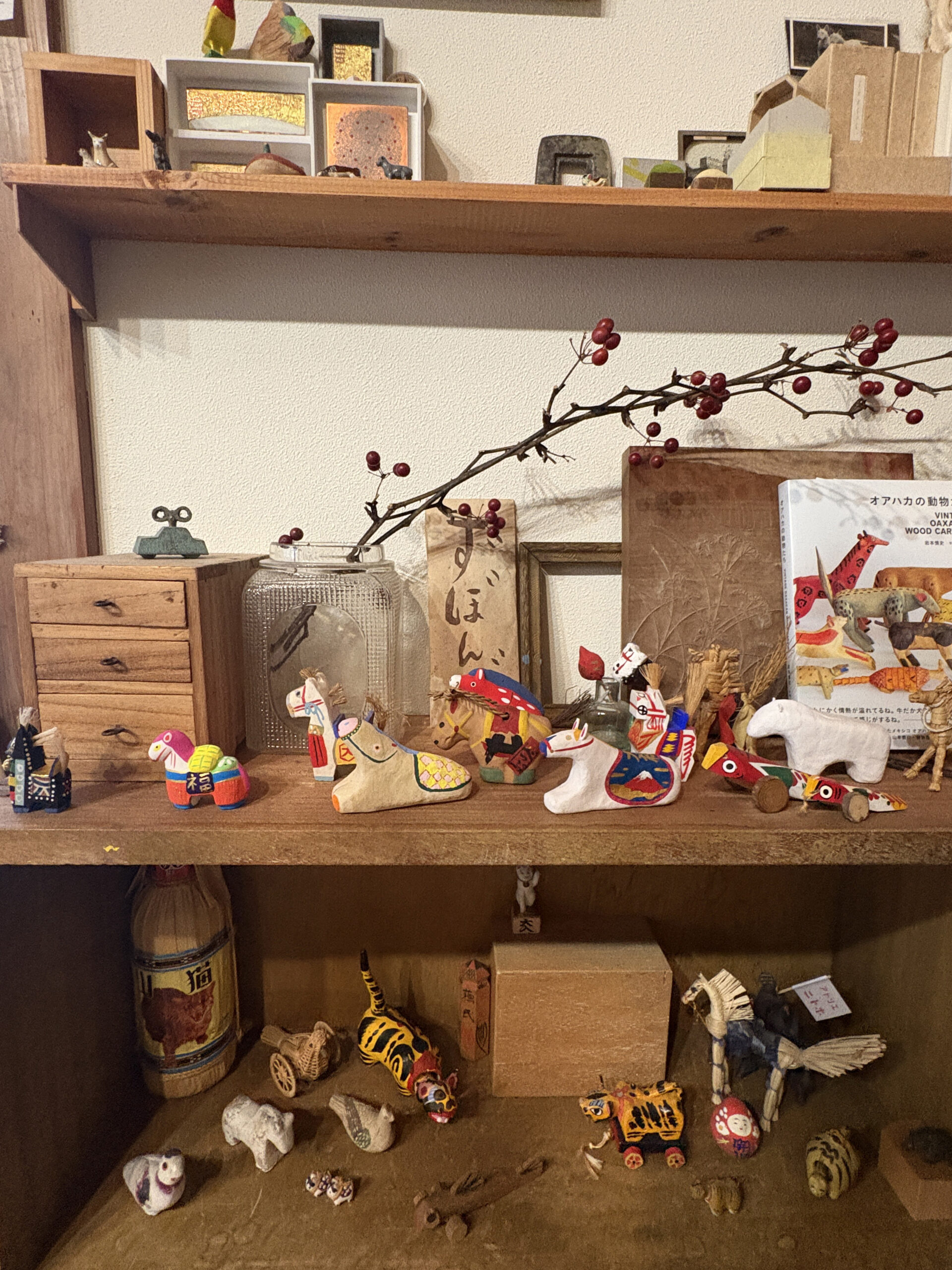 小さい頃は世代的にビックリマンシールやガンダムのカード、ポケモンカードなど、当時の流行り物を集めていたんですけど、大学生になってから色んな物に興味を持ち始めて、アンティークの小瓶や雑貨だったりを集め始めました。やはりそれも全部ちいさい手のひらサイズのものでしたね。ネットでも色々探すと、知らない物で溢れていて、世の中には見えてなかったものがたくさんあるんだなと思いました。郷土玩具や骨董品、ボタンやガラスの小瓶なんかもこの頃から集めていました。細かいものは大体のジャンル分けをして箱に仕舞うんですが、集めすぎて闇鍋状態になってしまうこともあって。(笑)久々に箱を開けた時に、ここにあったんだという発見があって、それが制作に繋がることもあります。モチーフとして購入することもありますが、そうでなくても気になったらポチッとしてしまいますね。(笑)