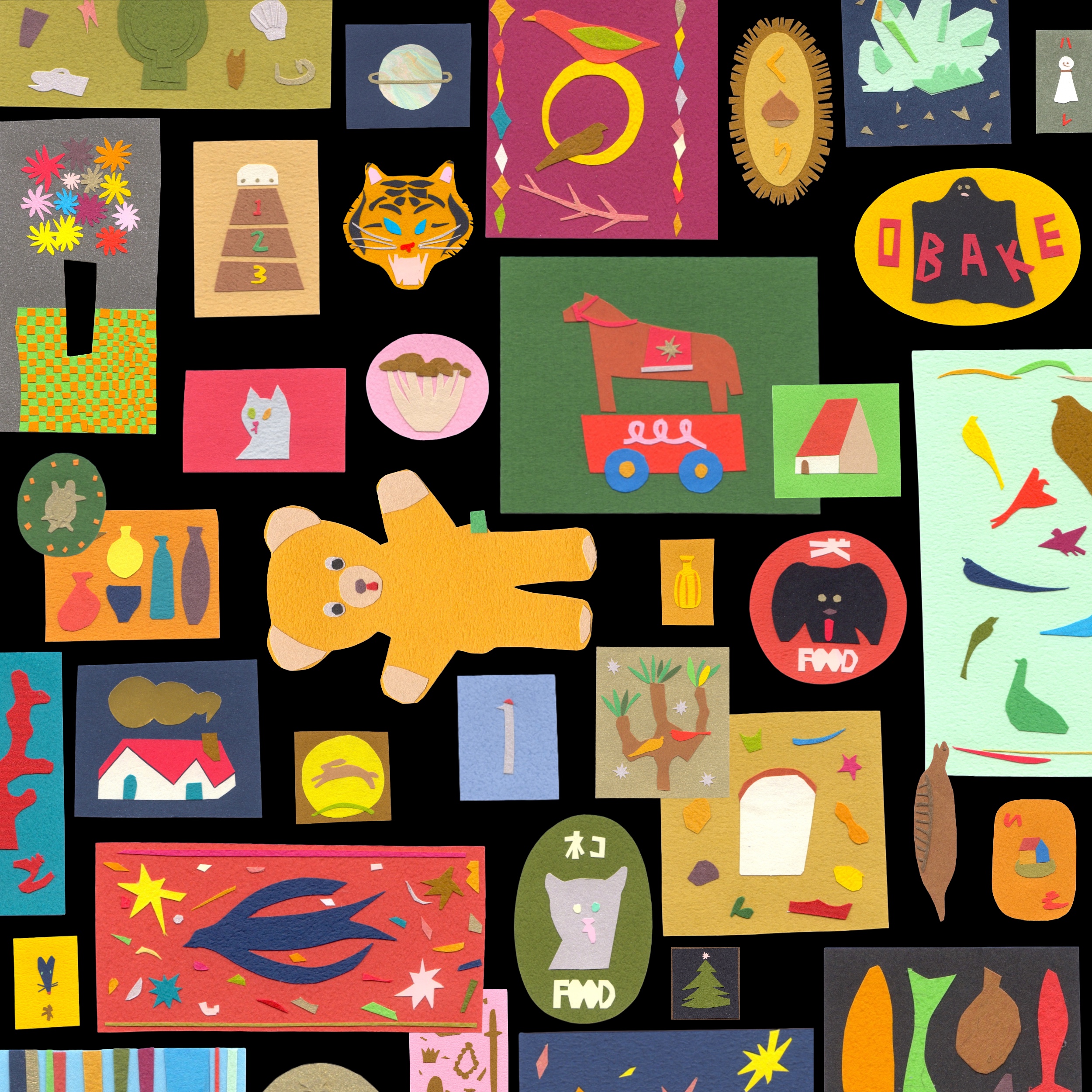 蒐集品の質感や雰囲気も伝えたいという気持ちがあります。でも描き込みすぎるとリアルになりすぎてしまうので、あえてシンプルでチープな形に置き換えて描いたりして、それが本物を見た時にギャップがあって面白いんじゃないかなと思っています。実物と作品を見た時に「あ、これはこの子なんだ」という気づきも面白いかなと。モチーフはさりげなく組み込むのもポイントで、「実は一部分だけ本物があるんですよ」っていう。何の変哲もない、シルエットだけでも伝えられるような物をモチーフにする時は、“そのもの過ぎない”ようにしています。